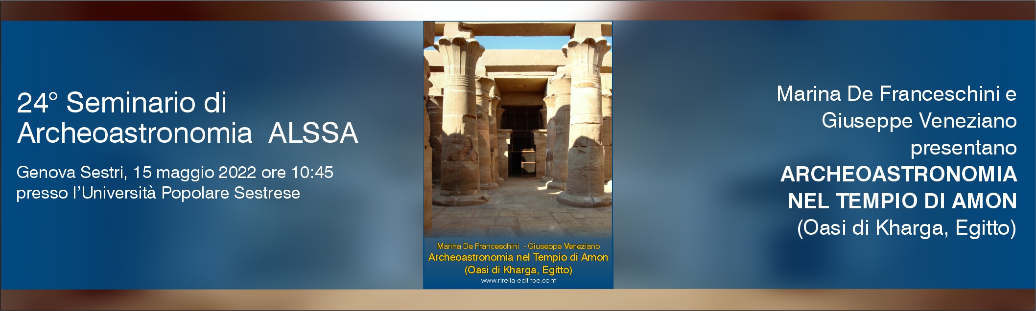 Domenica 15 maggio alle ore 10:45 Marina De Franceschini e Giuseppe Veneziano presentano al 24° Seminario uno studio sull'orientamento astronomico dell'antico tempio di Amon, situato nell'oasi di Kharga in Egitto.