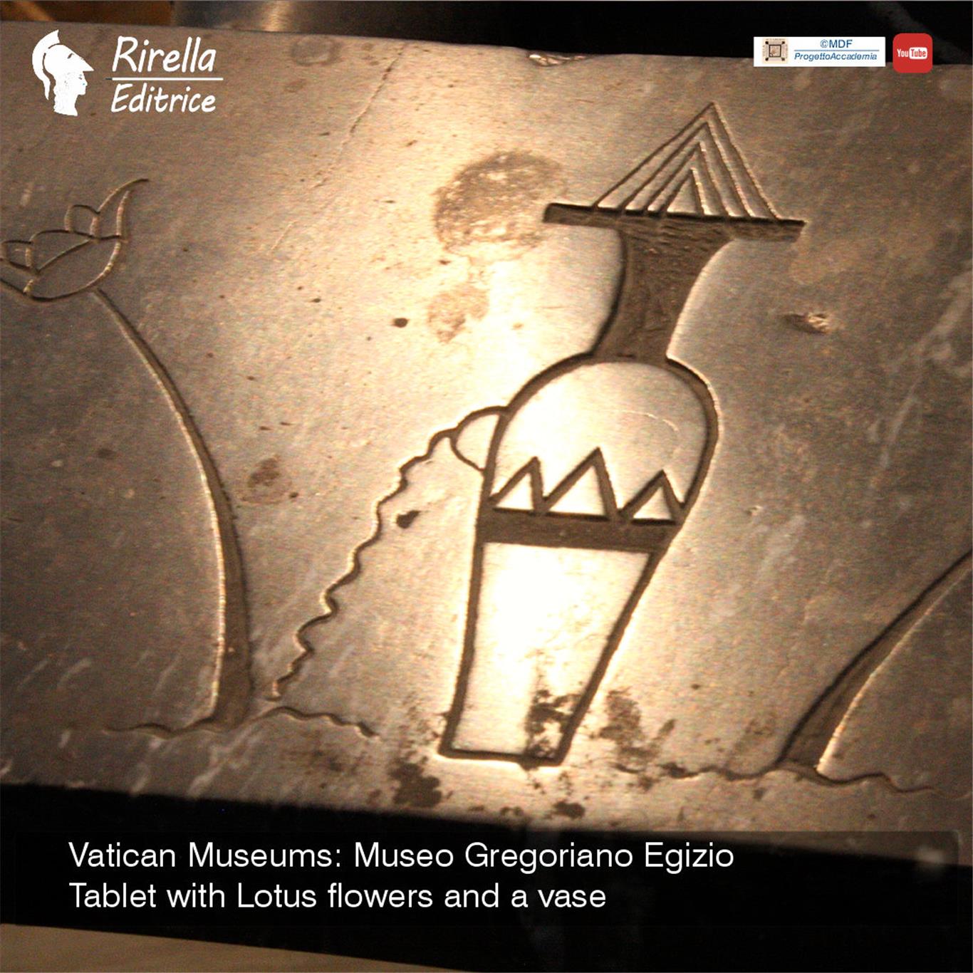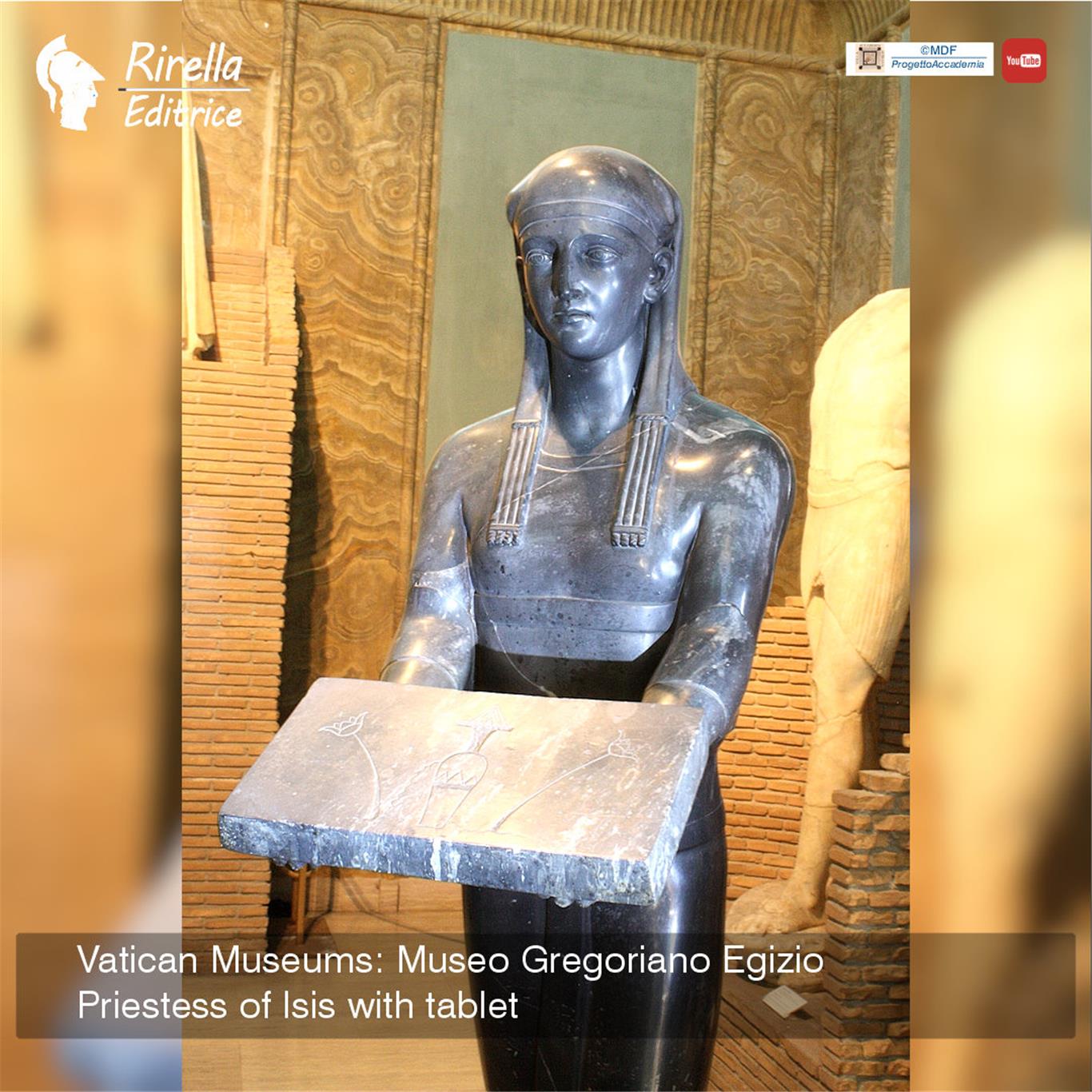 Behind the herm of Isis are three statues of priestesses of the goddess; one of them holds a tablet engraved with a small, stylized vase with two lotus flowers.
