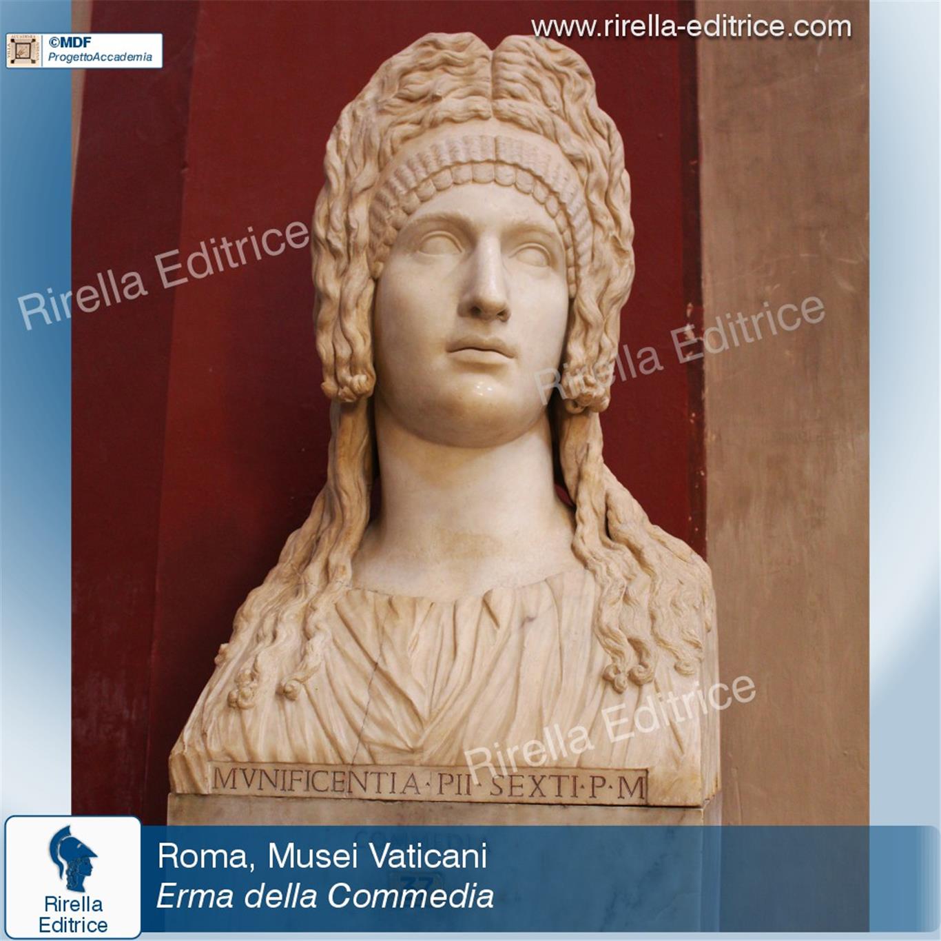 L’Erma della Tragedia ha una bellissima corona con tralci di vite e grappoli d’uva. Quella della Commedia invece ha una elaborata pettinatura con i boccoli che ricadono sulle spalle. Si trovano oggi nei Musei Vaticani, nella Sala Rotonda del Museo Pio-Clementino.